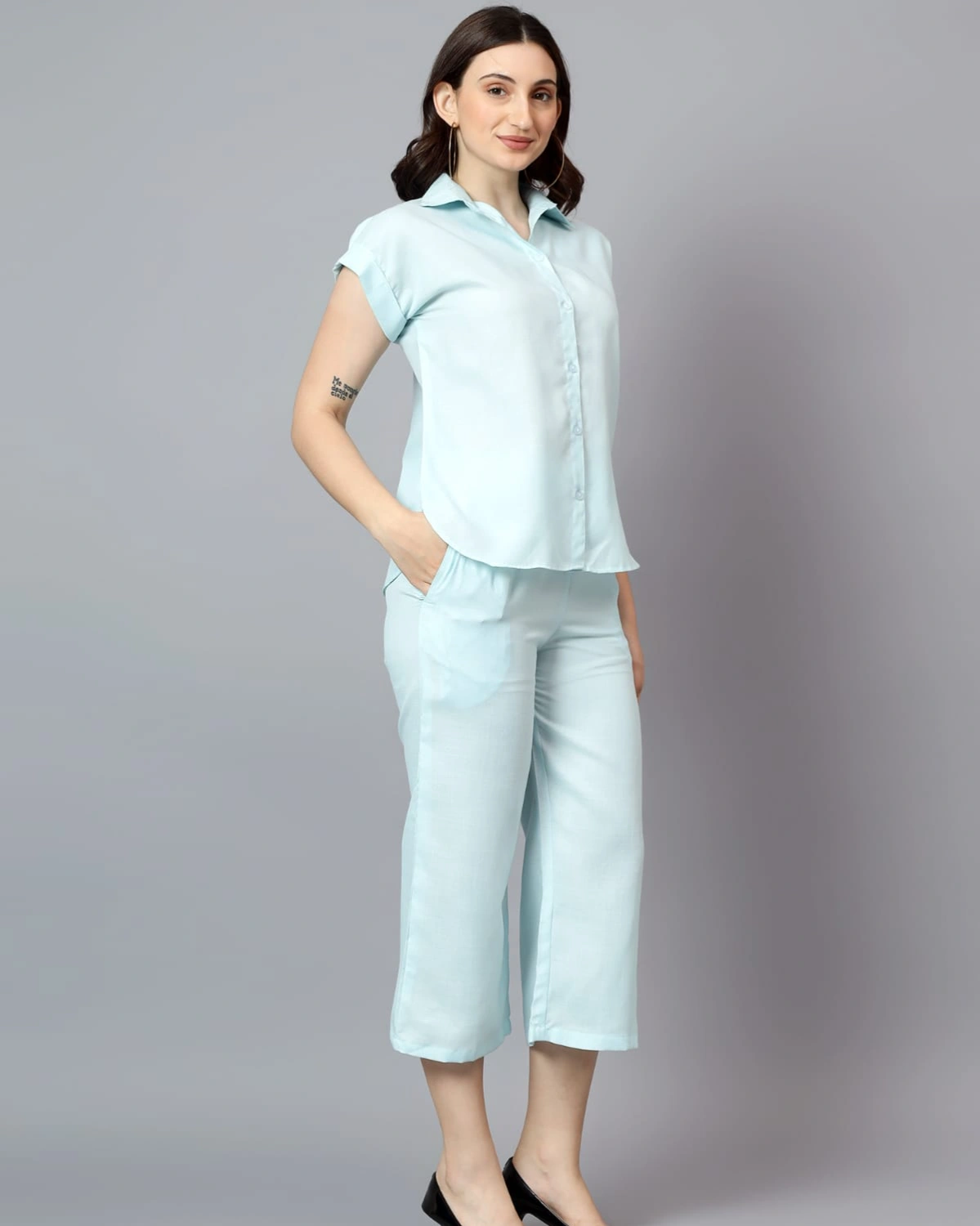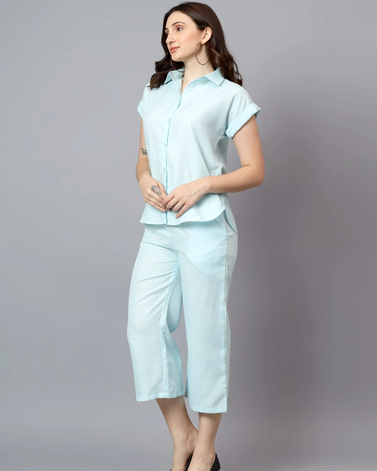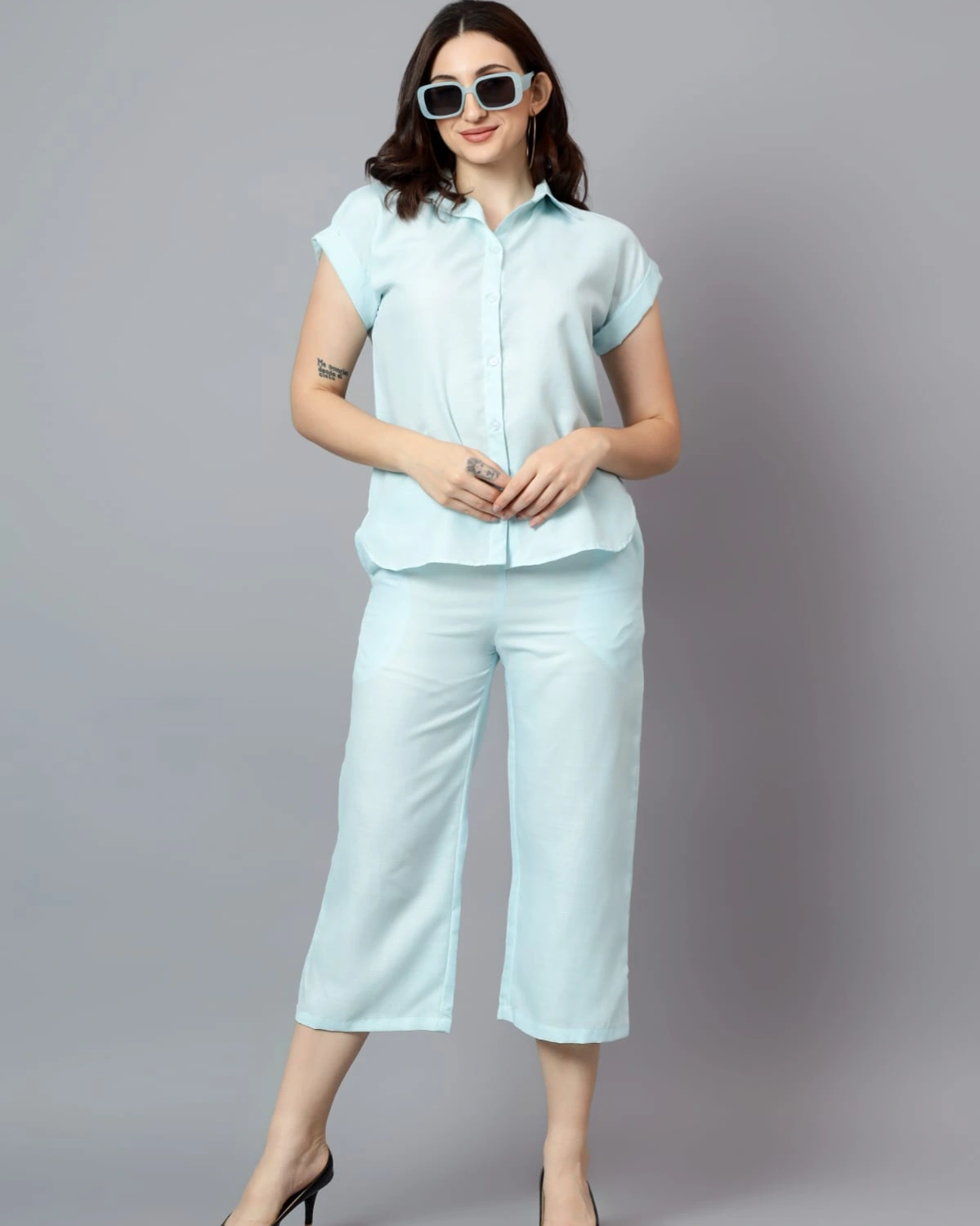 Stay cool and refined with this Powder Blue 100% Linen Coord Set. Featuring a short-sleeve collared shirt and cropped trousers, this set combines effortless style with breathable comfort—perfect for warm days and versatile wear.
