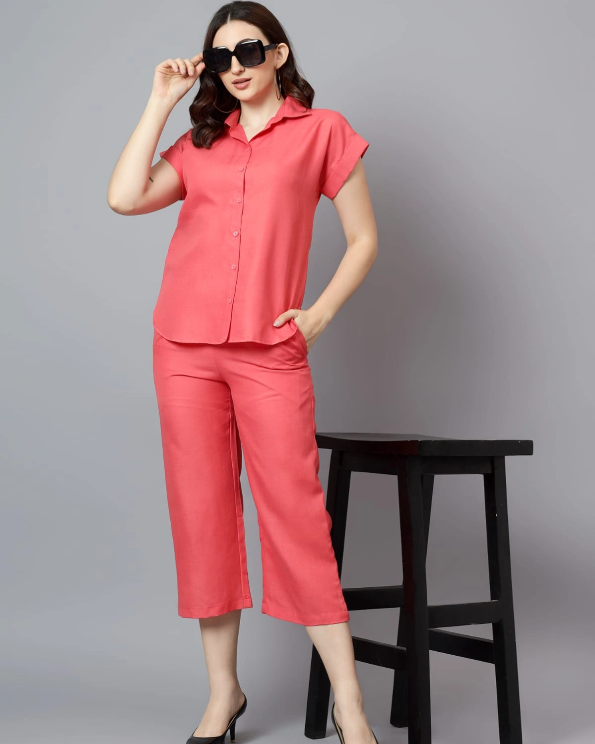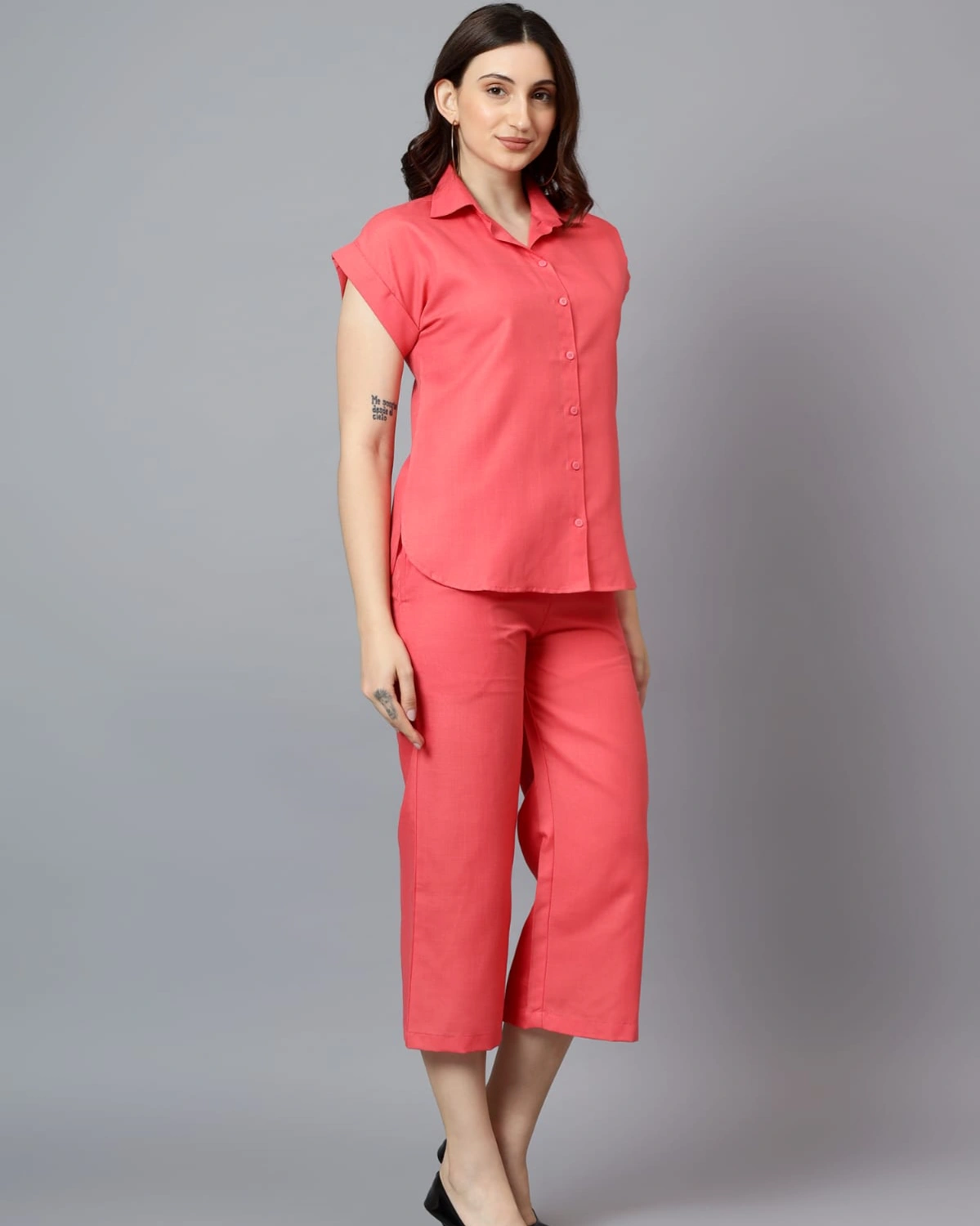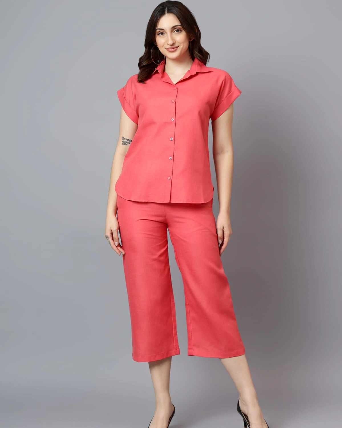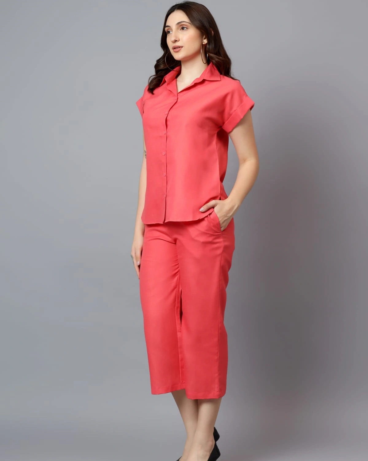 Keep it chic and breathable with this Coral Linen Coord Set, designed for effortless everyday style. The short-sleeve collared shirt pairs with cropped straight-fit pants, offering a perfect blend of comfort and elegance. Crafted from lightweight linen, it’s ideal for warm days while keeping you looking stylish.