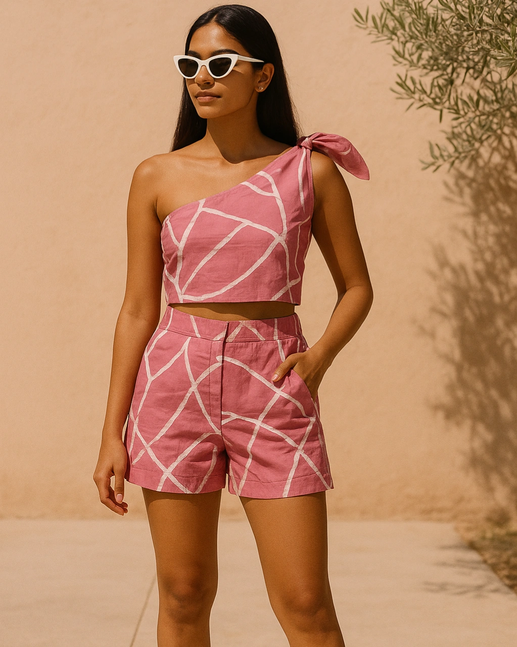 Fresh and playful, this Pink Abstract Printed Co-ord Set is the perfect blend of comfort and modern style. Crafted from breathable cotton rayon, it features a bold ivory abstract line print that adds a contemporary touch. The one-shoulder crop top is designed with a chic tie-up detail and a concealed side zipper for a flattering fit, while the high-waist tailored shorts complete the look with effortless ease. Ideal for sunny brunches, vacations, or casual day outings, this set brings versatility and charm to your wardrobe.