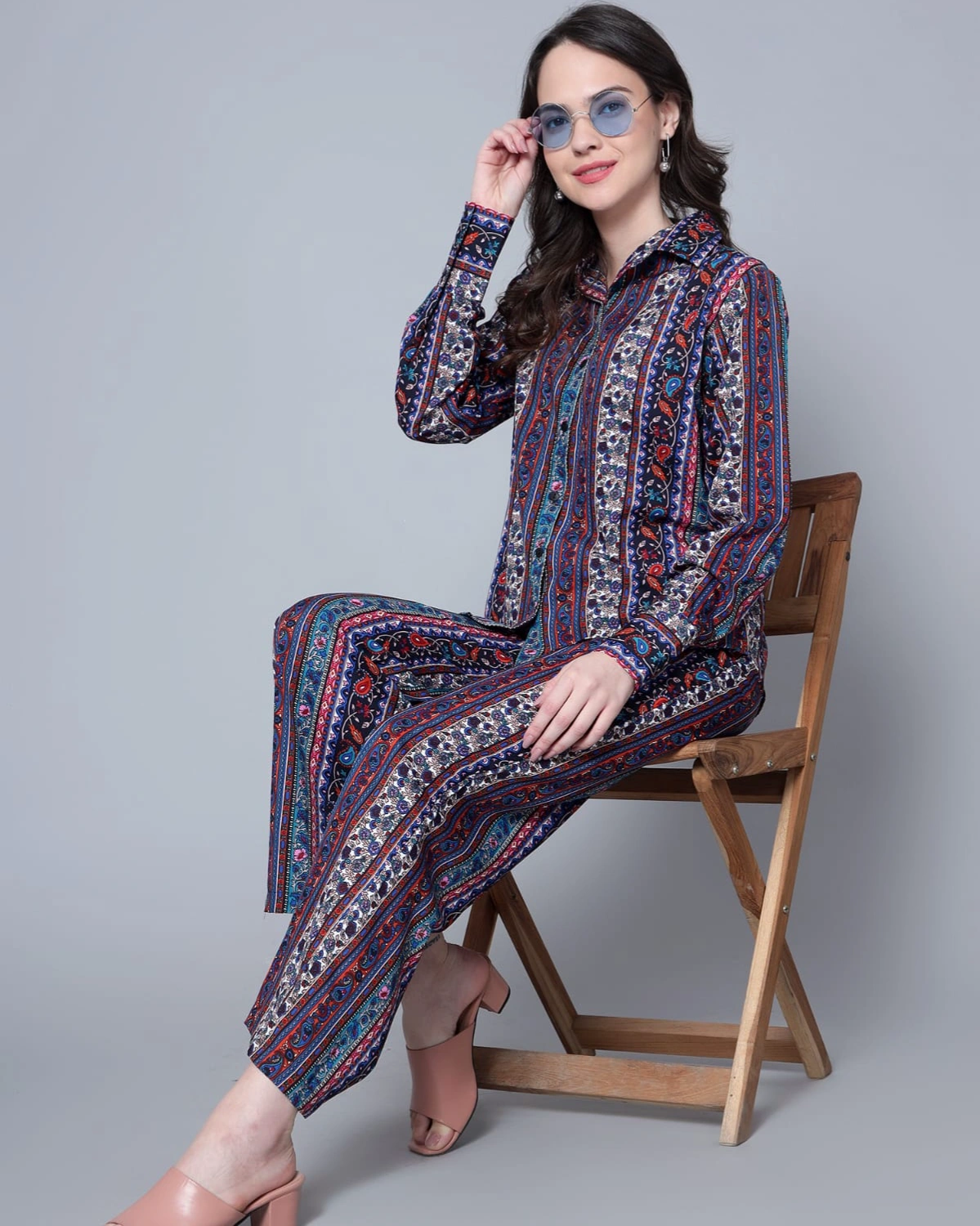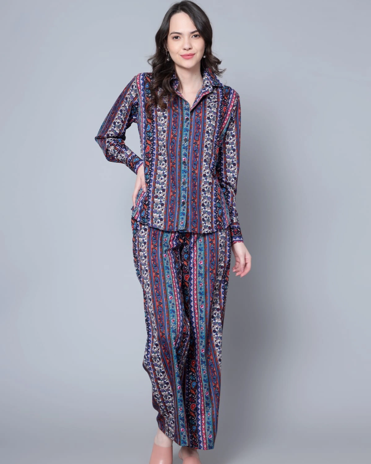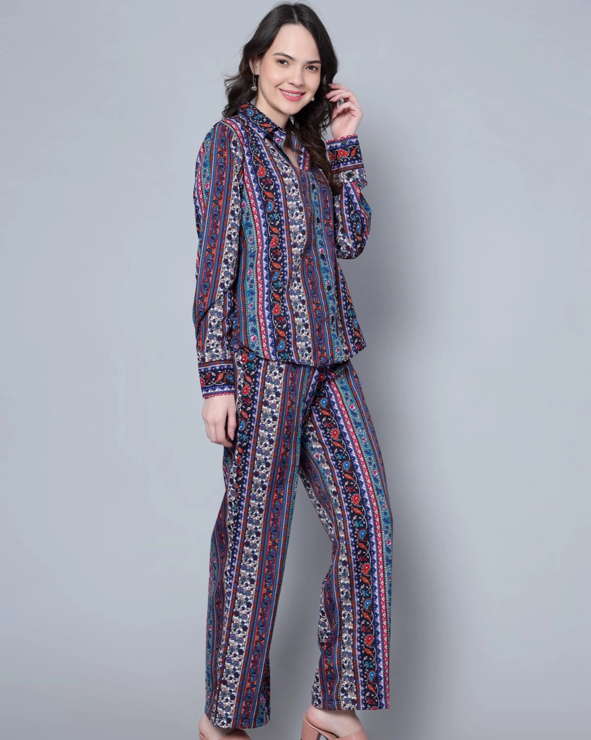 Turn heads in this Multicolor Printed Coord Set, designed in flowy polycrepe for a sleek and lightweight feel. The collared button-down shirt pairs effortlessly with straight-fit pants, while the vibrant geometric-inspired print adds a bold, stylish edge.