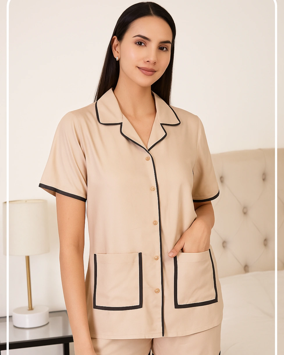 Designed for all-day comfort and ease. Featuring a short-sleeved button-down shirt with contrast piping and roomy front pockets, paired with matching relaxed-fit shorts, this set is perfect for warm nights or casual lounging. Crafted from soft, breathable cotton rayon, it combines classic charm with modern comfort.