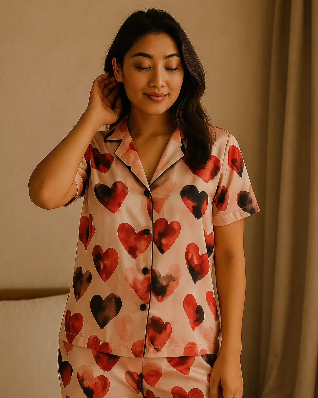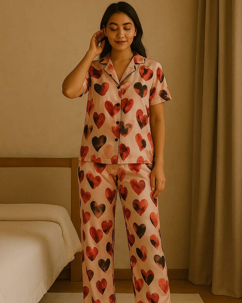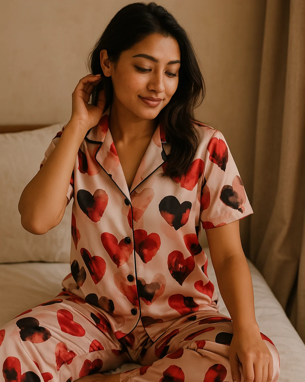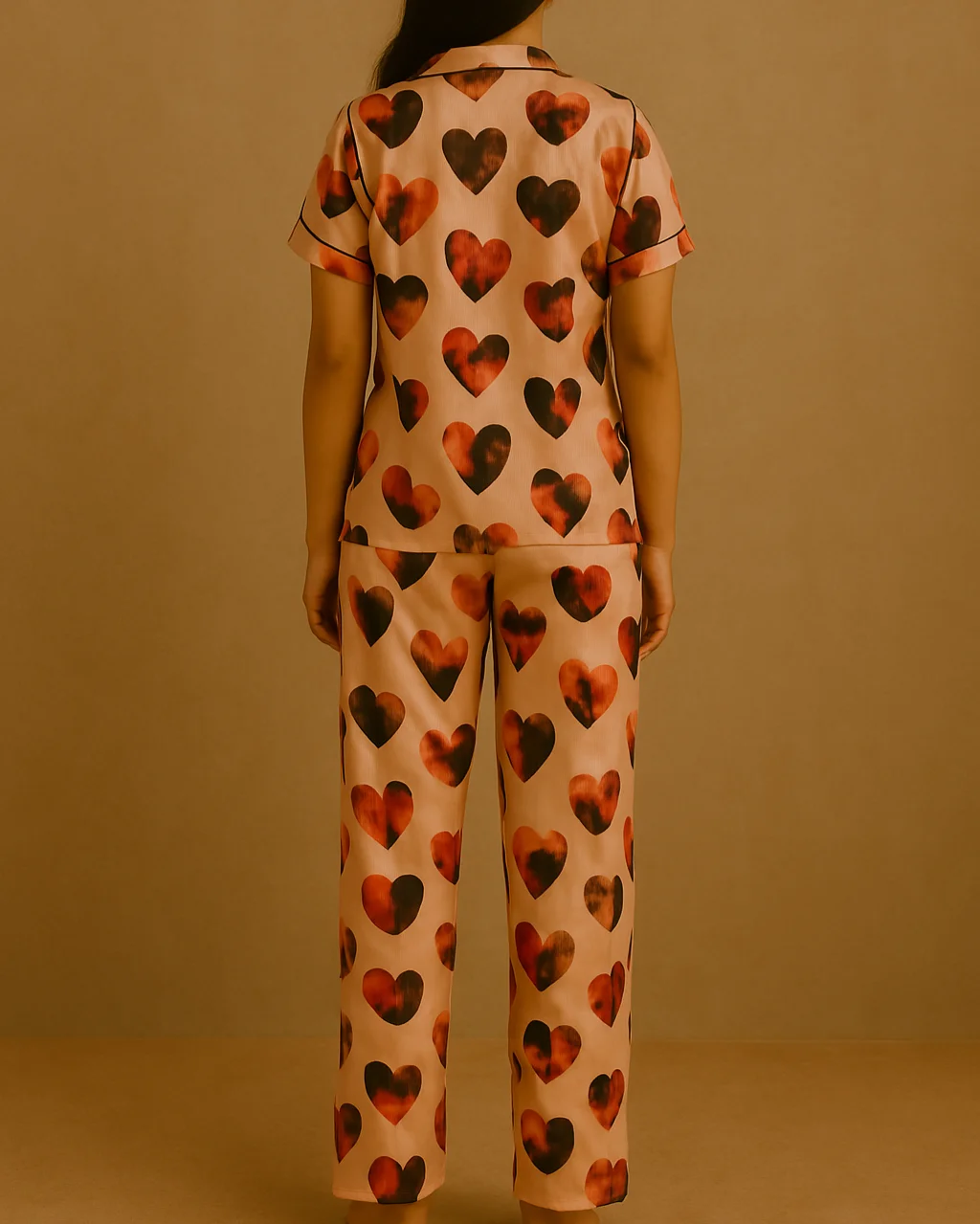 Unwind in ultimate comfort and charm with this adorable satin co-ord nightwear set. Designed for cozy evenings and relaxed mornings, this set features a silky button-down shirt with a notched collar and short sleeves, paired with matching straight-fit pants. The playful heart print in vibrant shades of red and black pops beautifully against the soft blush-toned satin fabric, creating a romantic yet fun bedtime look.