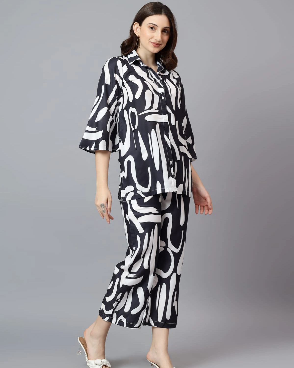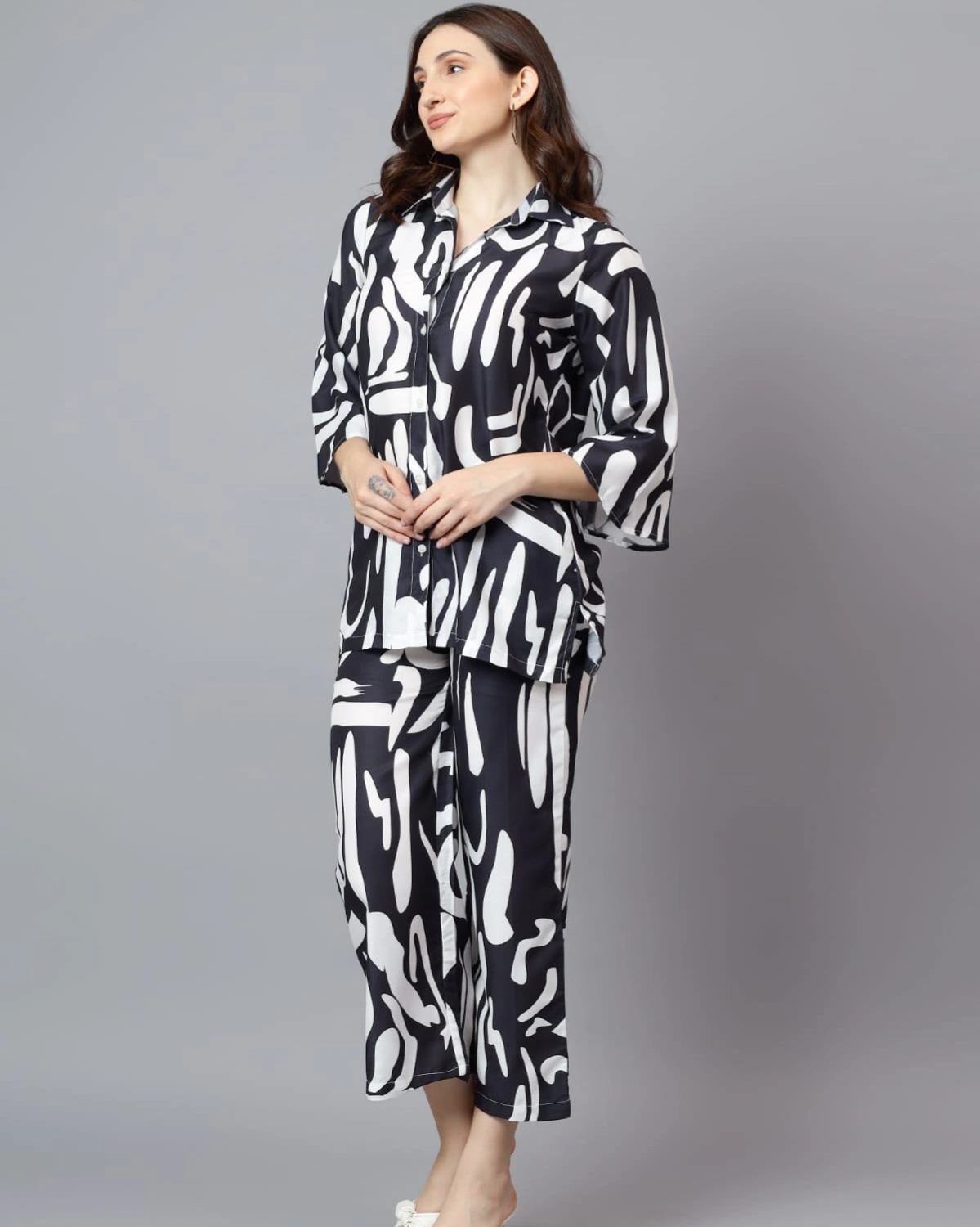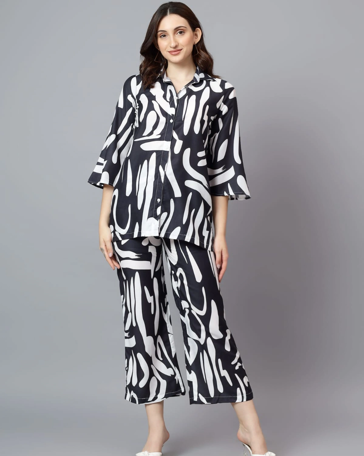 Make a bold statement with this Black & White Printed Coord Set in Soft Linen. Featuring a relaxed button-down shirt with flared sleeves and cropped trousers, it blends comfort with modern sophistication.