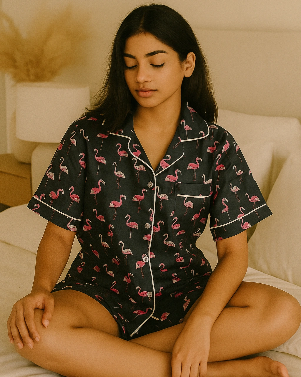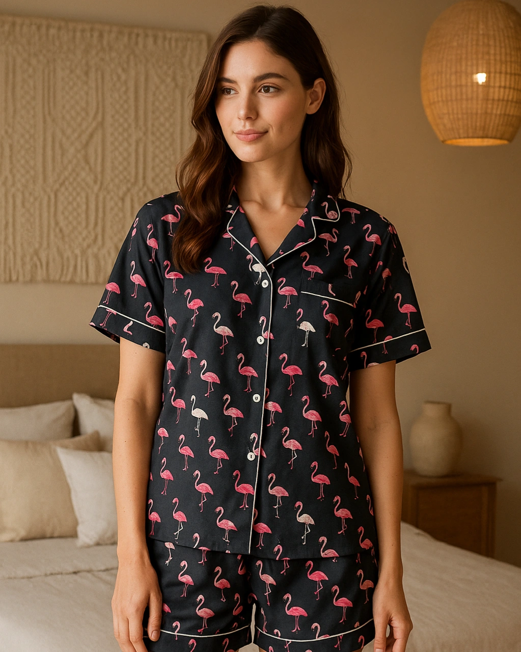 Designed for both comfort and charm. Featuring a short-sleeved button-down shirt with contrast piping and a chest pocket, paired with relaxed-fit shorts, this set brings fun and functionality together. The soft and breathable cotton rayon fabric makes it perfect for cozy nights, laid-back mornings, or lounging in style.
