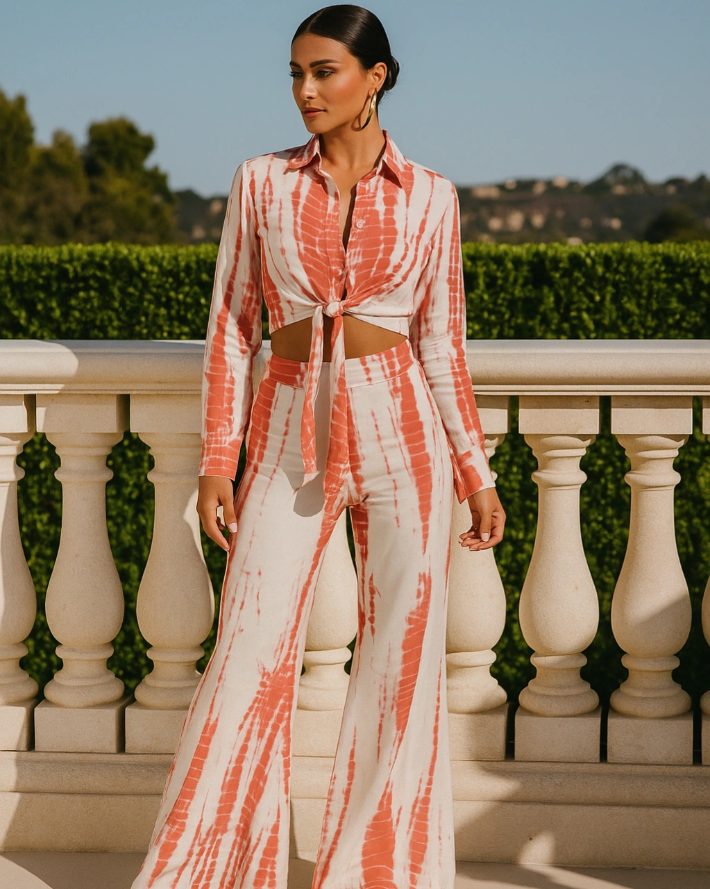 Turn heads with this chic Tie-Dye Coord Set, crafted in breathable cotton rayon for all-day comfort. Featuring a button-down shirt with a front knot detail and paired with wide-leg trousers, this set effortlessly blends relaxed elegance with a modern edge. Perfect for vacations, brunch dates, or casual outings, it’s your go-to for effortless style with a playful twist.