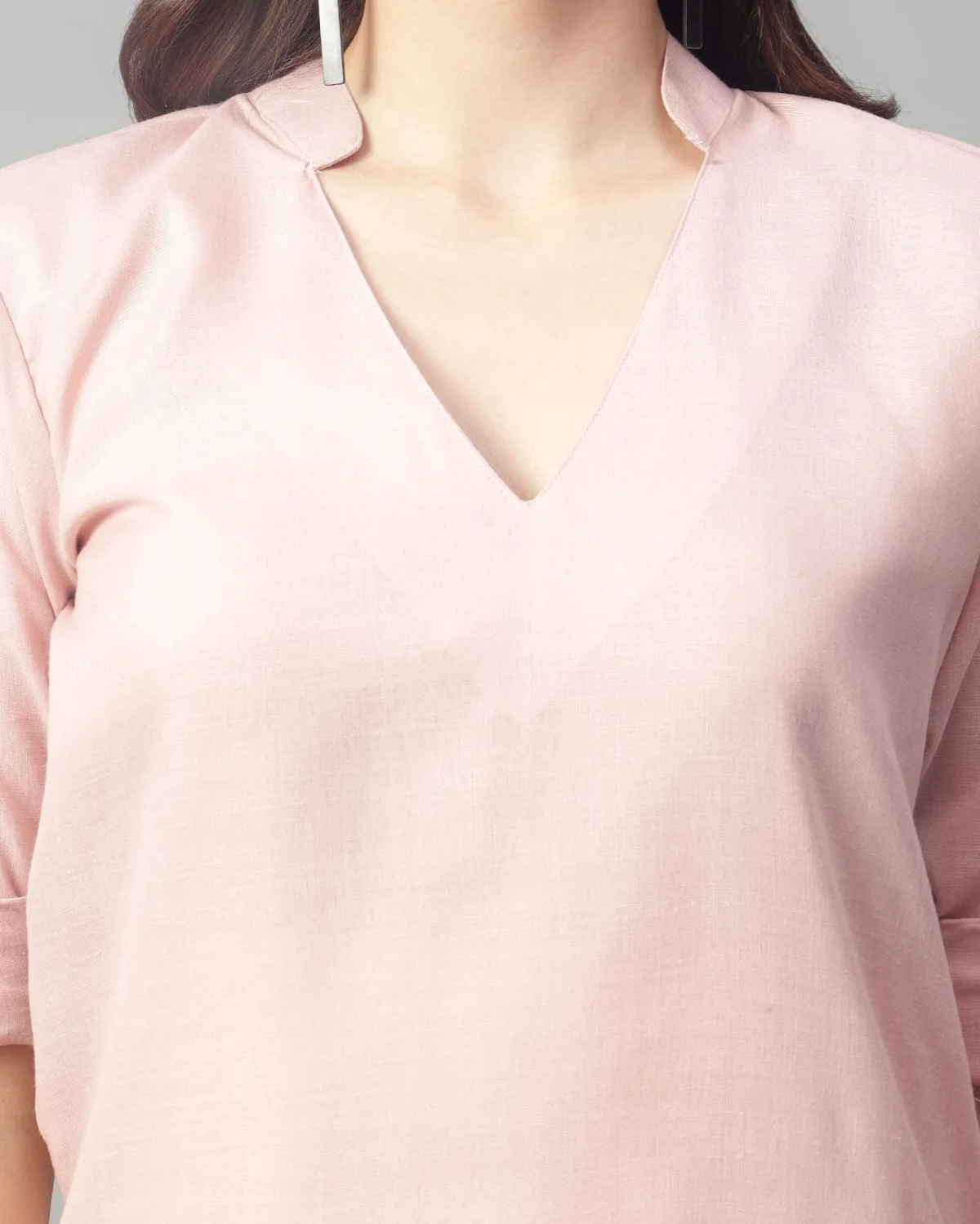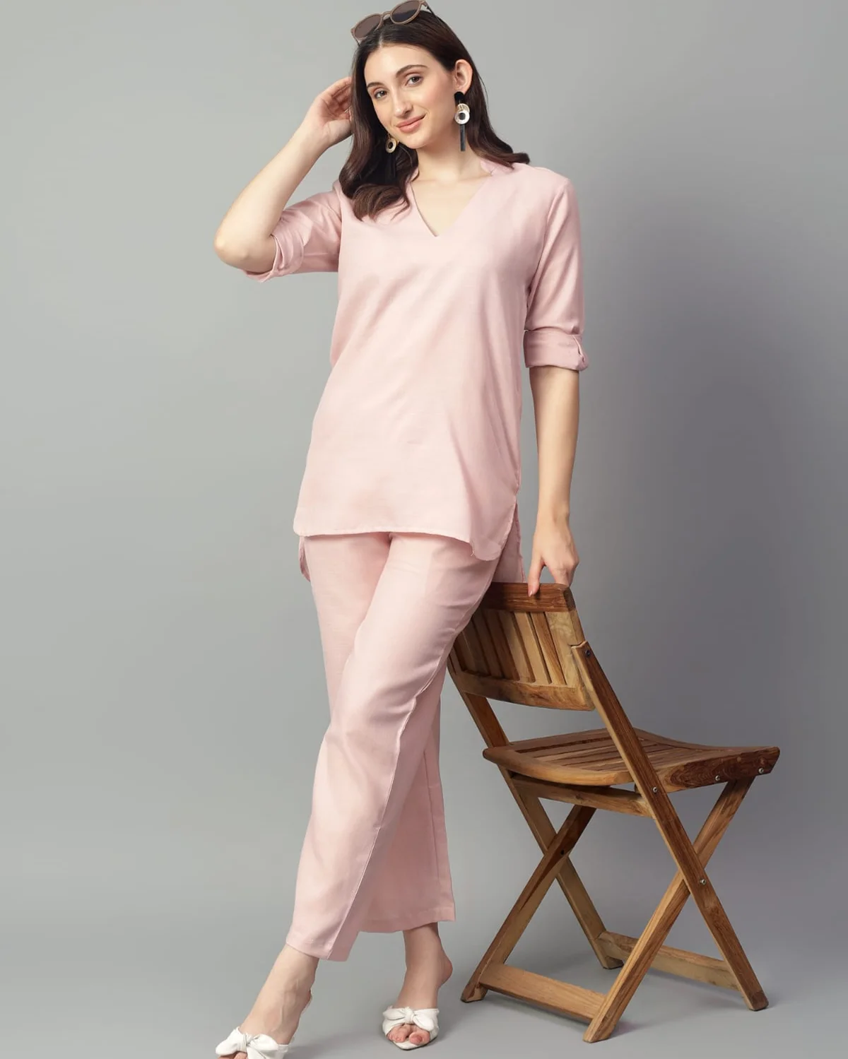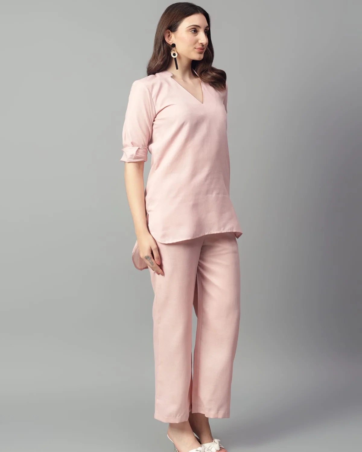 Made from a breathable linen blend, this two-piece set includes a V-neck top with 3/4th roll-up sleeves and side slits for ease, paired with ankle-length straight-leg trousers.