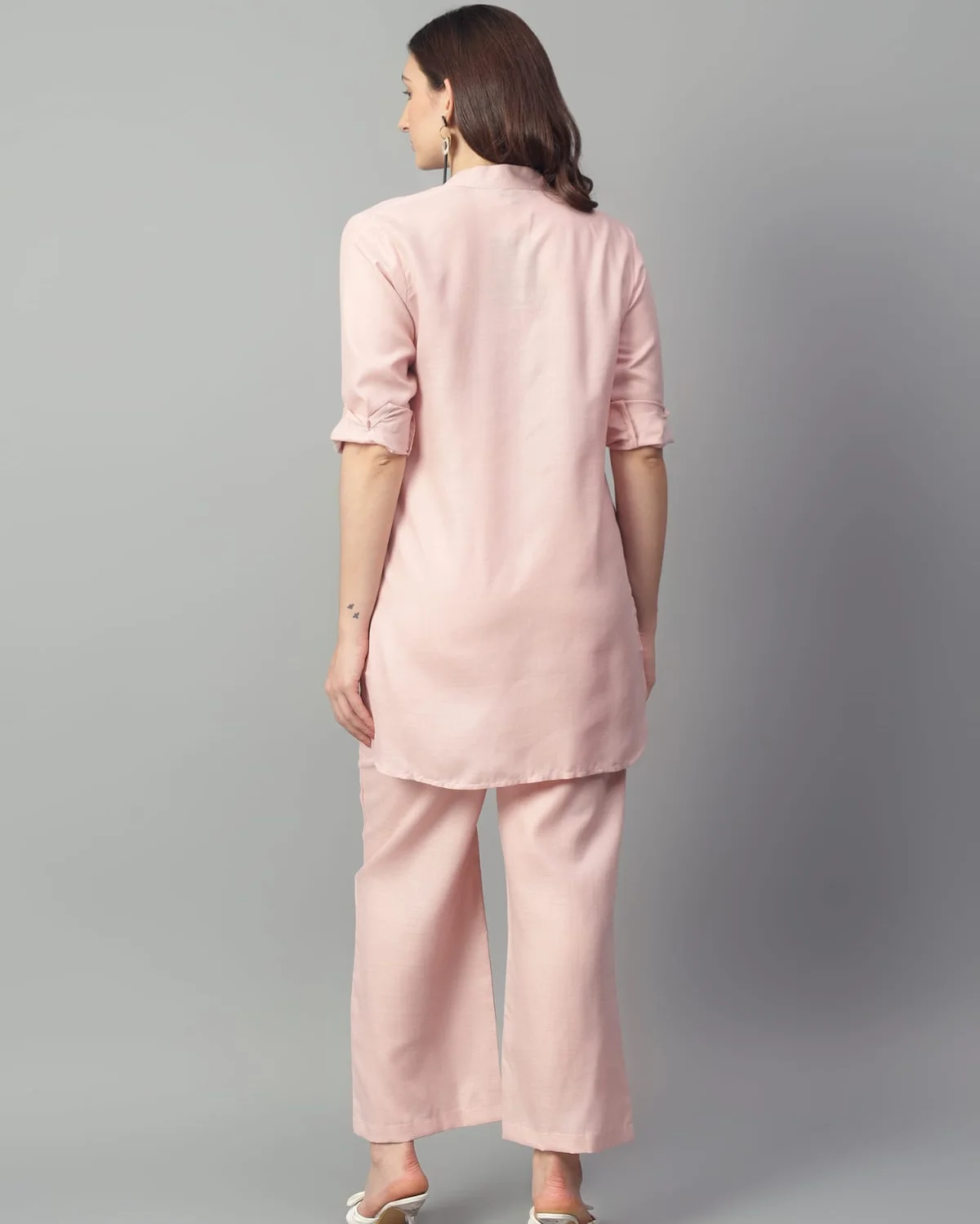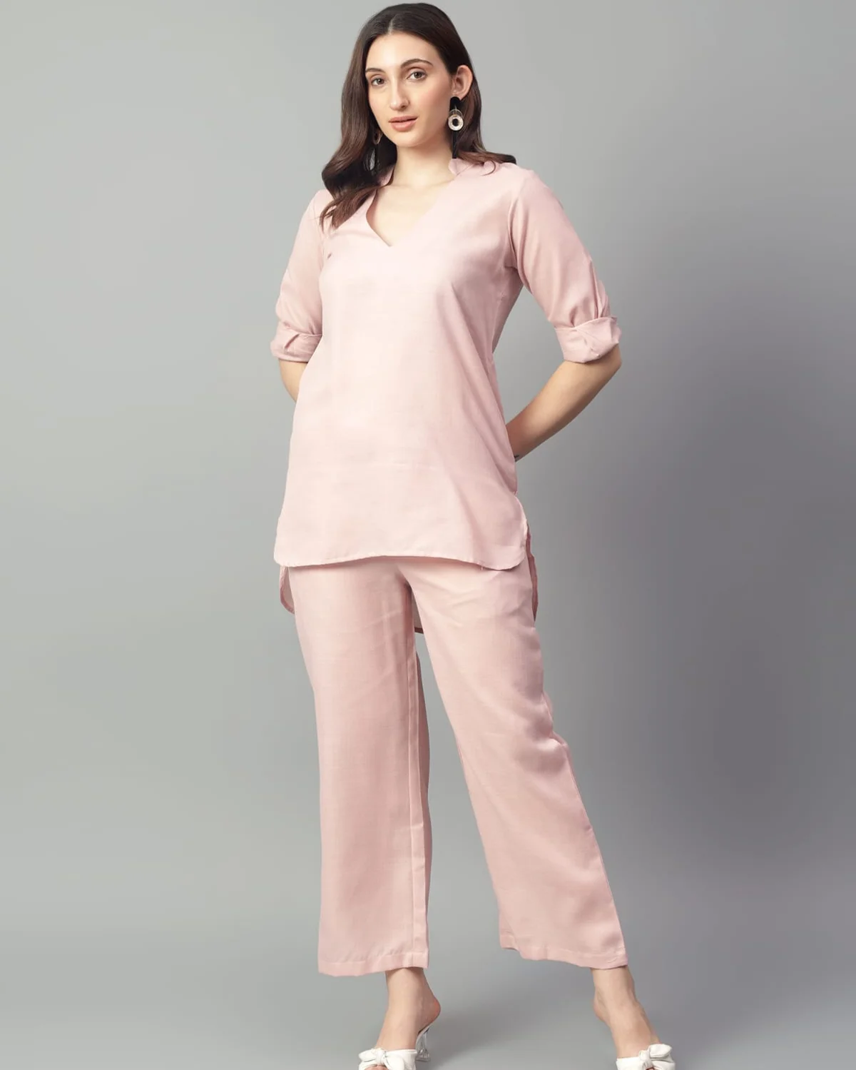 Design: Solid co-ord set with a relaxed top and straight pants