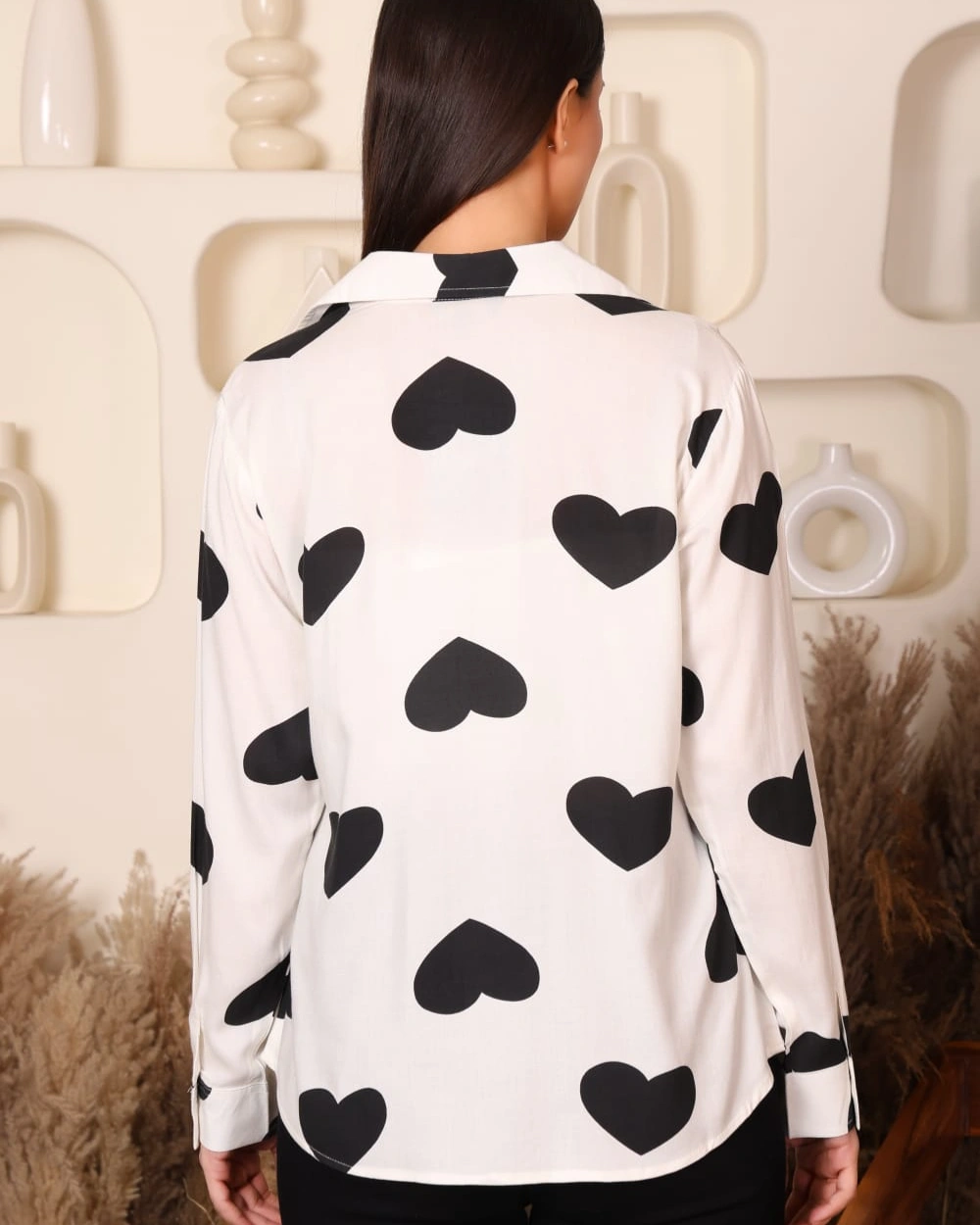 Playful yet stylish, this White Heart-Print Shirt is crafted from breathable cotton rayon for all-day comfort. The bold black heart motifs add a fun twist to the classic button-down, making it perfect for casual outings or smart-casual looks.